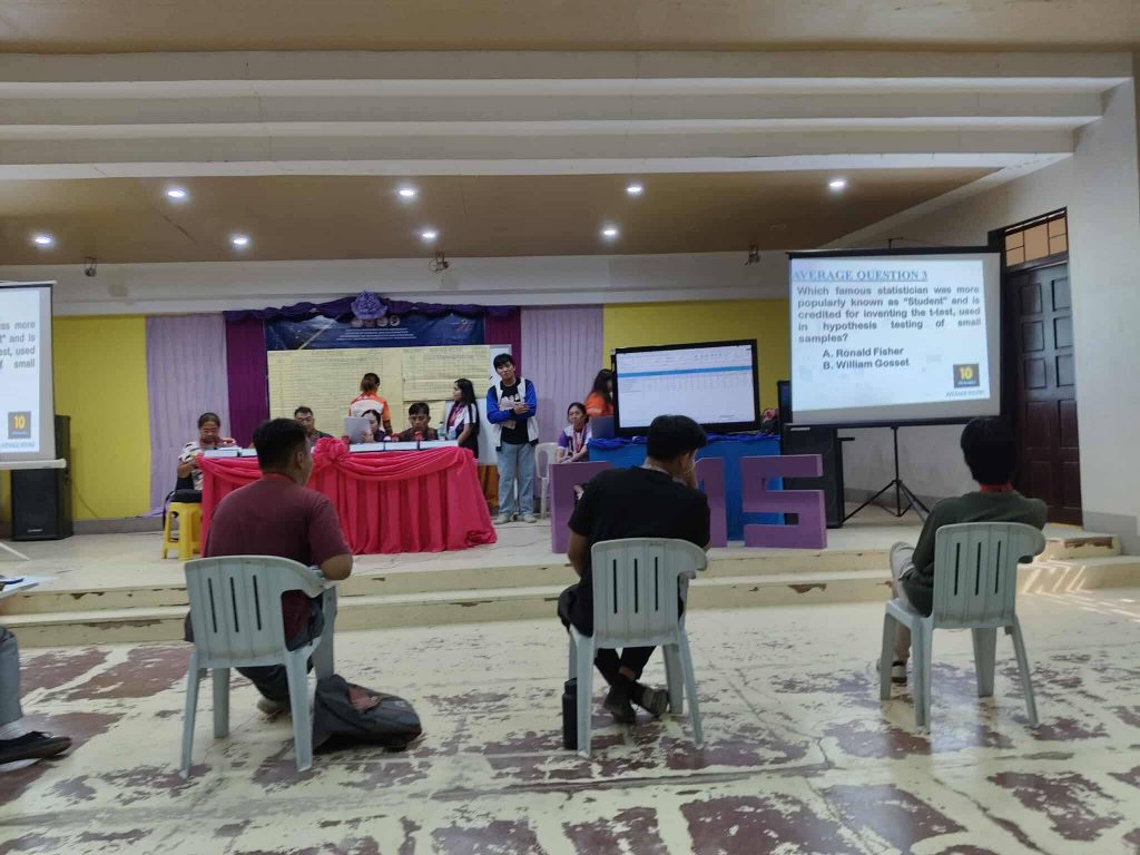 ๐๐๐ซ๐๐ก๐๐๐ข ๐๐ฎ๐๐ซ๐ข ๐. ๐๐๐ง๐ข, a BS Mathematics student from the College of Science and Mathematics scored 35 points overall, securing the first-place position for this yearโs University-Wide Statistic Quiz. In second place, ๐๐๐ซ๐๐ก๐๐๐ฆ ๐๐ฎ๐ญ๐๐ฅ, a BS Mechanical Engineering from the College of Engineering scored 29 points in total. Moreover, the 3rd and 4th place tied with 27 points, and a Tie Breaker Round was held. After that, ๐๐ฎ๐ฌ๐ฎ๐ ๐. ๐๐๐ฃ๐, from the College of Nursing secured the 3rd Place and ๐๐๐ซ๐ ๐๐จ๐ฌ๐ก๐ฎ๐ ๐. ๐๐๐ฅ๐ฎ๐ฆ๐ฉ๐จ๐ง๐ , from the College of Computing Studies, secured the 4th Place. Furthermore, ๐๐ฎ๐ฌ๐ญ๐ข๐ง๐ ๐. ๐๐๐ง๐ญ๐๐ง๐, from the College of Engineering, scored 25 points in total, placing 5th in the competition.