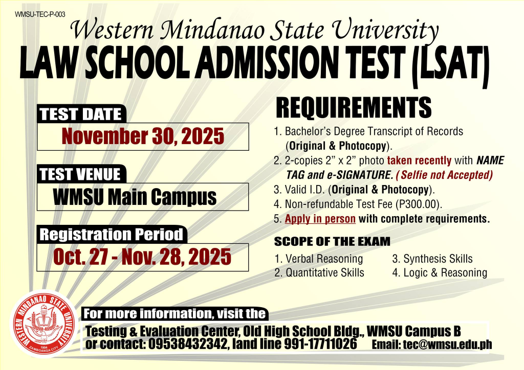 4. For questions and clarifications, we are available during weekdays (excluding holidays), from 8:00 AM to 5:00 PM. You may contact us at 09538432342, landline 991-1771 local 1026, or via email at tec@wmsu.edu.ph.