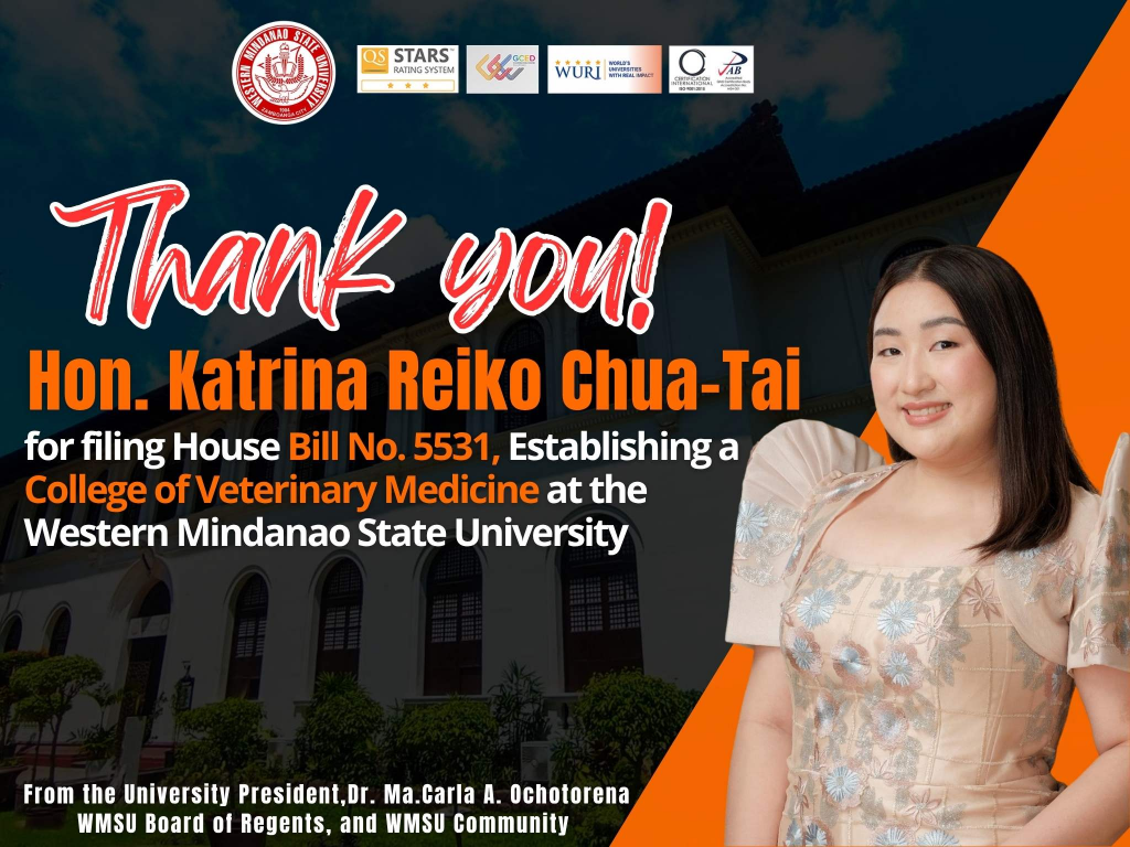 Western Mindanao State University (WMSU) is delighted with the filing of House Bill No. 5531 seeking to establish a College of Veterinary Medicine at WMSU, in accordance with the provisions of Republic Act No. 9268, otherwise known as the Philippine Veterinary Medicine Act of 2004. The bill was filed by Hon. Katrina Reiko Chua-Tai, 1st District Representative of Zamboanga City.